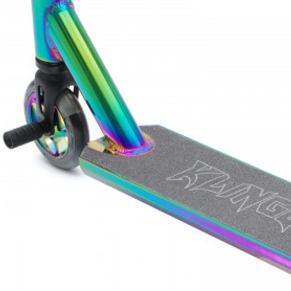 Самокат трюковый Haevner KLINGER неохром – надежная техника с ярким выделяющимся дизайном. Маневренность и плавность движения гарантируются небольшим весом 3,9 кг и кассетного типа рулевой стойкой. Ступица и алюминиевая дека 110*500 мм (закалка Т6) со скошенными дропами изготовлены из Алюминия 6061. Пользователи массой не более 100 кг смогут выполнять трюки на рампах и специально оборудованных дорожках, благодаря колесам 110 мм (для этого увеличена жесткость до 88 А).